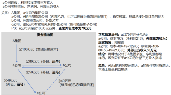 实际操作比看着还绕。a公司先把这笔业务以80万 “卖” 给b公司(额外多给1万的价格),但实际跟b私下约定,要适当的帮些忙,从他们这边多走些业务增加收入流水;接着,b公司将下面的一笔类似业务以50万元的价格给到a公司,找了c来配合,主要是最终保证这笔资金增加a收入的同时还能安全回流到b;a接到这笔50万元的业务后,以49万元的价格再外包给c,最后c将资金回流给b。