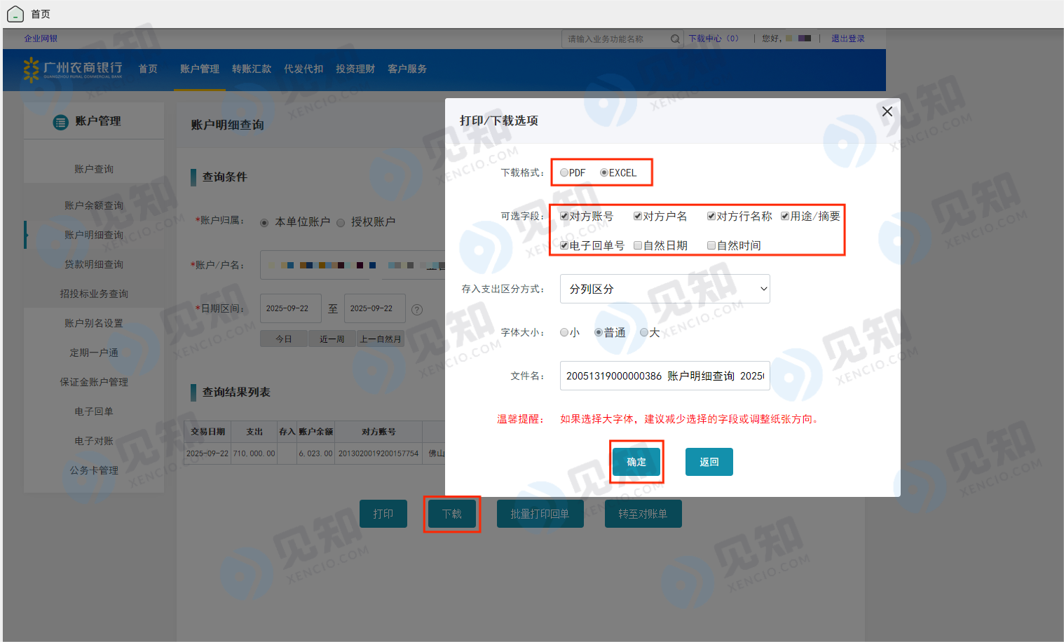 广州农村商业银行 - 交易流水导出电子流水交易明细导出指南 – 企业网银版 下载时间段: 1. 登录企业网银-点击“账户管理”-点击“账户明细查询”-选择查询条件-点击“查询” 2. 点击“下载”-选择下载格式-勾选全部可选字段-点击“确定” Post Views: 4