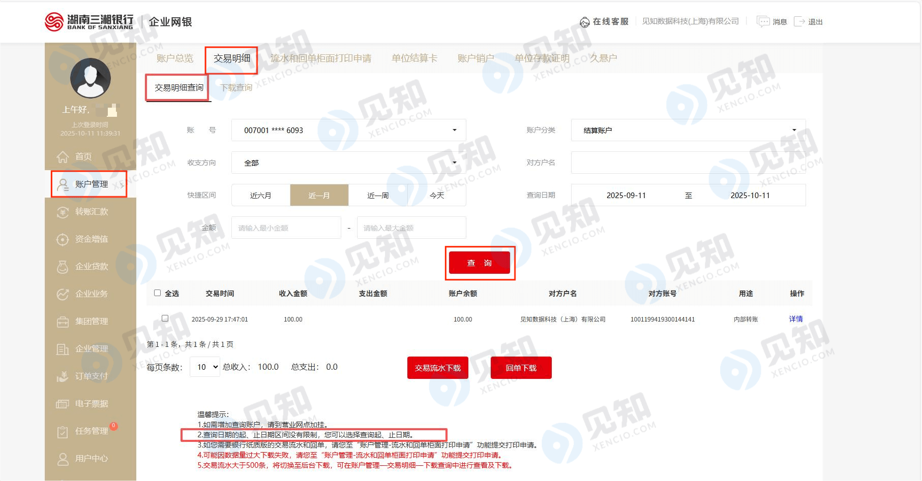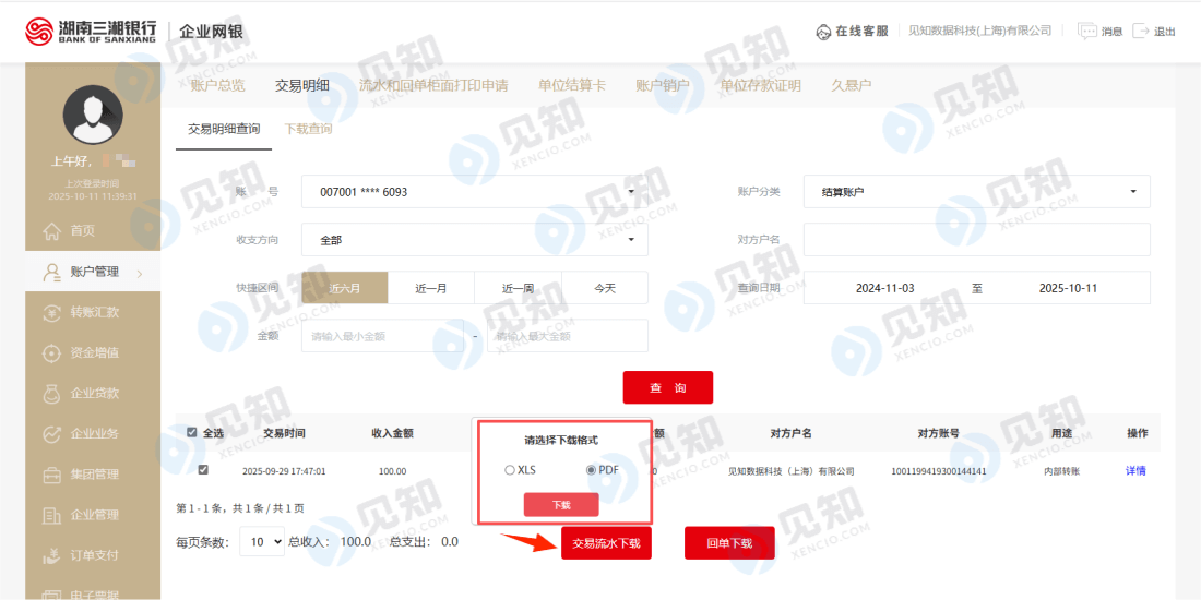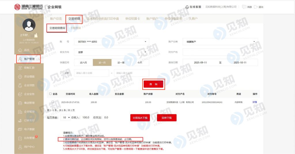 湖南三湘银行 - 交易流水导出电子流水交易明细导出指南 – 企业网银版 下载时间段:不限 1. 登录企业网银 2. 点击“账户管理”-点击“交易明细”-选择起止日期-点击“查询” 3. 选择下载PDF或Excel流水 Post Views: 4